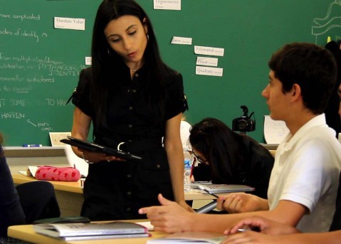 翻轉課堂的表現方式不盡相同,我只能講一下我自己對翻轉課堂的定義:在我的課堂上,學生大多數都是在家自己的筆記本電腦上,也有人是在iPad上觀看視頻。當學生進入學校上課的時候,我們的任務一般都是處理他們遇到的問題。通常情況下,我們會一起深入探討視頻中教授的內容。我們會采用互動討論的方式上課,而非單向的講座。在討論中,學生們分成小組解決問題或者解決個人遇到的問題。這些基本上都是學生們之前可能會在家庭作業中遇到的他們無法解決的問題。